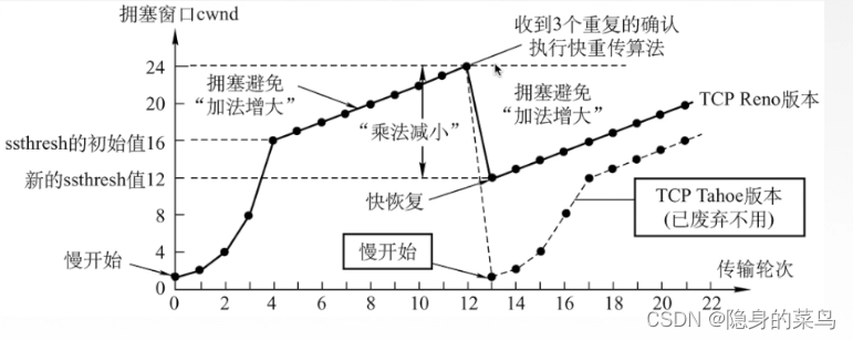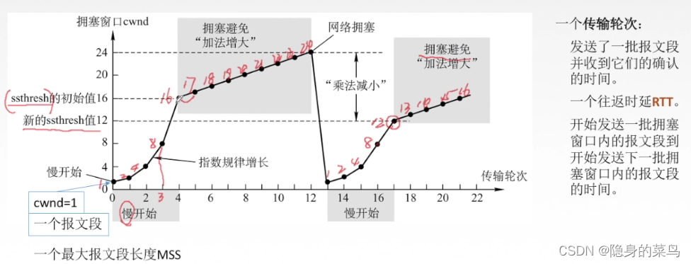 网络拥塞后,不会降为初始值,就是快恢复,门限值降一半