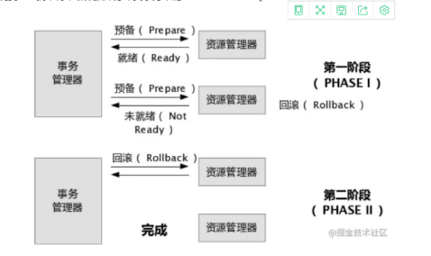 第一阶段:事务管理器要求每个涉及到事务的数据库预提交(precommit)此操作,并反映是否可以提交.