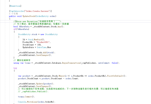 消费者接收消息,更新数据库,在方法名中代入 [CapSubscribe("")],框架已经为我们做好了,如果失败,则消息队列会重试