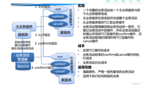 关于TCC(Try-Confirm-Cancel)的概念,最早是由Pat Helland于2007年发表的一篇名为《Life beyond Distributed Transactions:an Apostate’s Opinion》的论文提出。 TCC事务机制相比于上面介绍的XA,解决了其几个缺点: 1.解决了协调者单点,由主业务方发起并完成这个业务活动。业务活动管理器也变成多点,引入集群。 2.同步阻塞:引入超时,超时后进行补偿,并且不会锁定整个资源,将资源转换为业务逻辑形式,粒度变小。 3.数据一致性,有了补偿机制之后,由业务活动管理器控制一致性