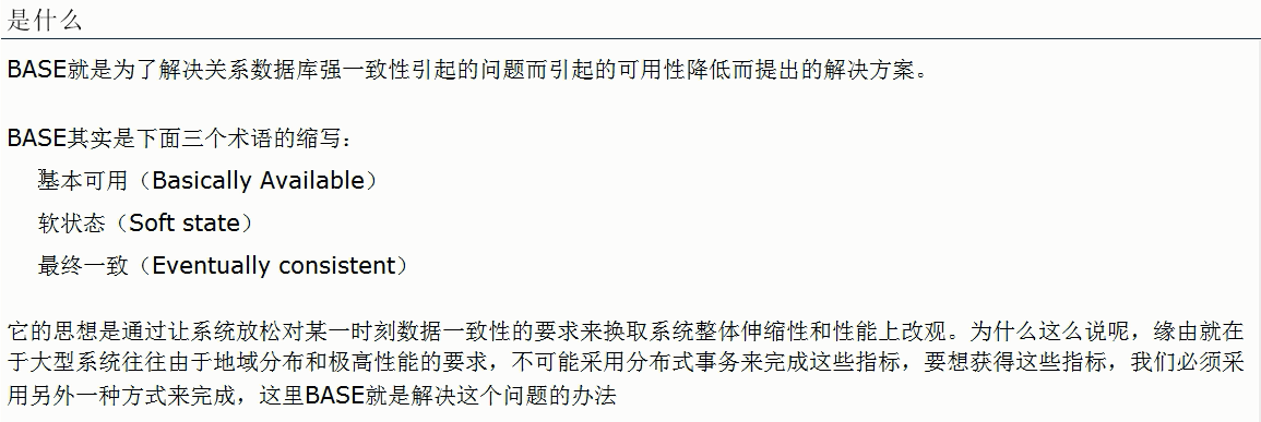 一致性和可用性之间取一个平衡。多余大多数web应用,其实并不需要强一致性。