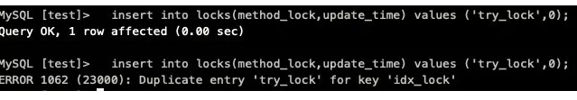 利用表的 UNIQUE KEY idx_lock(method_lock)作为唯一主键,当进行上锁时进行 Insert 动作,数据库成功录入则以为上锁成功,当数据库报出 Duplicate entry 则表示无法获取该锁。