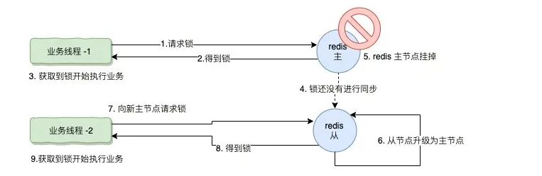 这个时候,一旦主挂掉或者网络抖动等各种原因,可能会切换到“从”节点,这个时候可能会导致两个业务线程同时获取得两把锁。