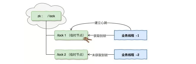业务线程 -1,业务线程 -2 分别向 ZK 的 /lock 目录下,申请创建有序的临时节点。
