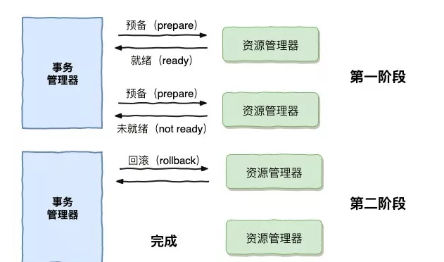 事务协调器要求每个数据库提交数据,或者回滚数据。
