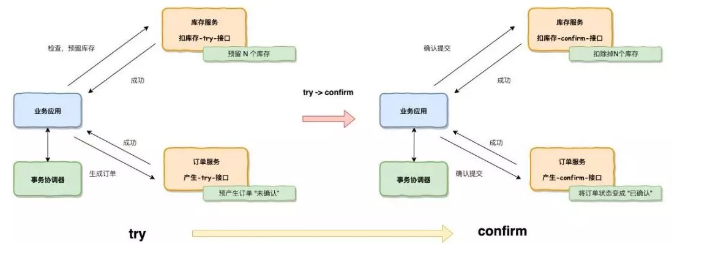 在 Try 的时候,会让库存服务预留 N 个库存给这个订单使用,让订单服务产生一个“未确认”订单,同时产生这两个预留的资源。
