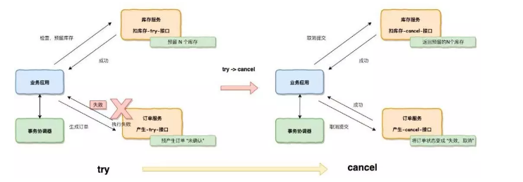 因为有了补偿机制,可以由业务活动管理器进行控制,保证数据一致性。Try 阶段:Try 只是一个初步的操作,进行初步的确认,它的主要职责是完成所有业务的检查,预留业务资源。Confirm 阶段:Confirm 是在 Try 阶段检查执行完毕后,继续执行的确认操作,必须满足幂等性操作,如果 Confirm 中执行失败,会有事务协调器触发不断的执行,直到满足为止。Cancel 是取消执行:在 Try 没通过并释放掉 Try 阶段预留的资源,也必须满足幂等性,跟 Confirm 一样有可能被不断执行。