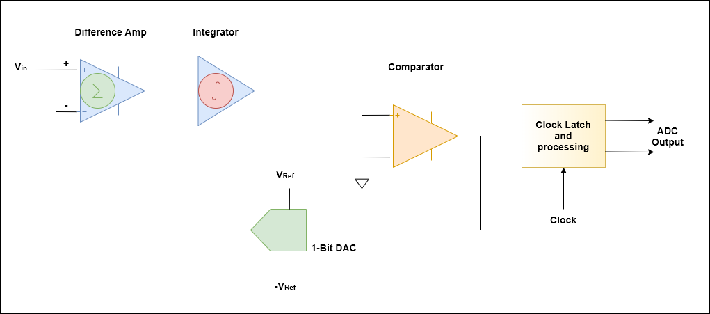 从输入端开始,差动放大器产生的输出为Vin与1位DAC输出之间的差。1位DAC的输出可以是以下两个值之一:或。在此拓扑结构中,可将积分器视为取前一个值和当前输入值的移动平均值。