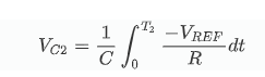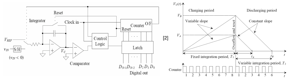 双斜率ADC与单斜率ADC的不同之处在于,现在将与地进行比较,并集成了两个电压和。刚开始时,负输入连接到积分器,使斜升直到计数器溢出。由于在反相输入会切换到一个负值进行积分,因此积分器输出将始终为正且大于零,因此计数器将继续运行直到溢出为止,这需要2N个时钟周期(= T1)。