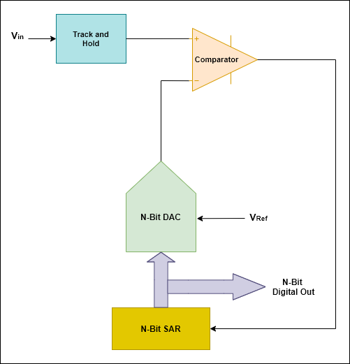 逐次逼近寄存器(Successive Approximation Register):逐次逼近ADC使用比较器逐次缩小包含输入电压的范围。在每个连续的步骤中,转换器将输入电压与内部数字与模拟转换器的输出进行比较,后者可能表示所选电压范围的中点。在这个过程的每一步,近似都被存储在一个逐次逼近寄存器(SAR)中。例如,假设输入电压为6.3 V,初始范围为0到16v。对于第一步,输入6.3 V与8v (0-16V范围的中点)进行比较。比较器报告输入电压小于8v,因此SAR被更新为将范围缩小到0 - 8v。第二步,将输入电压与4v (0 - 8v的中点)进行比较,比较器报告输入电压高于4v,因此更新SAR以反映输入电压在4 - 8v范围内。第三步,输入电压与6v比较(4v与8v的一半);比较器报告输入电压大于6伏,搜索范围变为6 - 8伏。继续这些步骤,直到达到预期的解决方案为止。