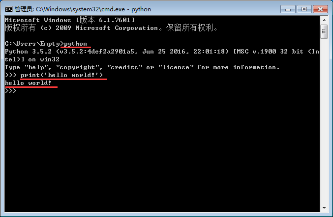 我们可以输入print('hello world!')来测试一下python运行,如下图