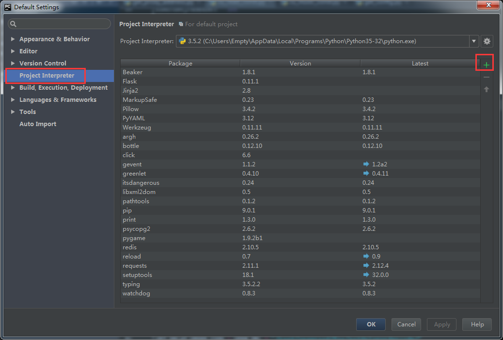 然后选择Project Interpreter,就可以看到已经安装好的python包列表了,点击右上角的+进入安装包选择界面