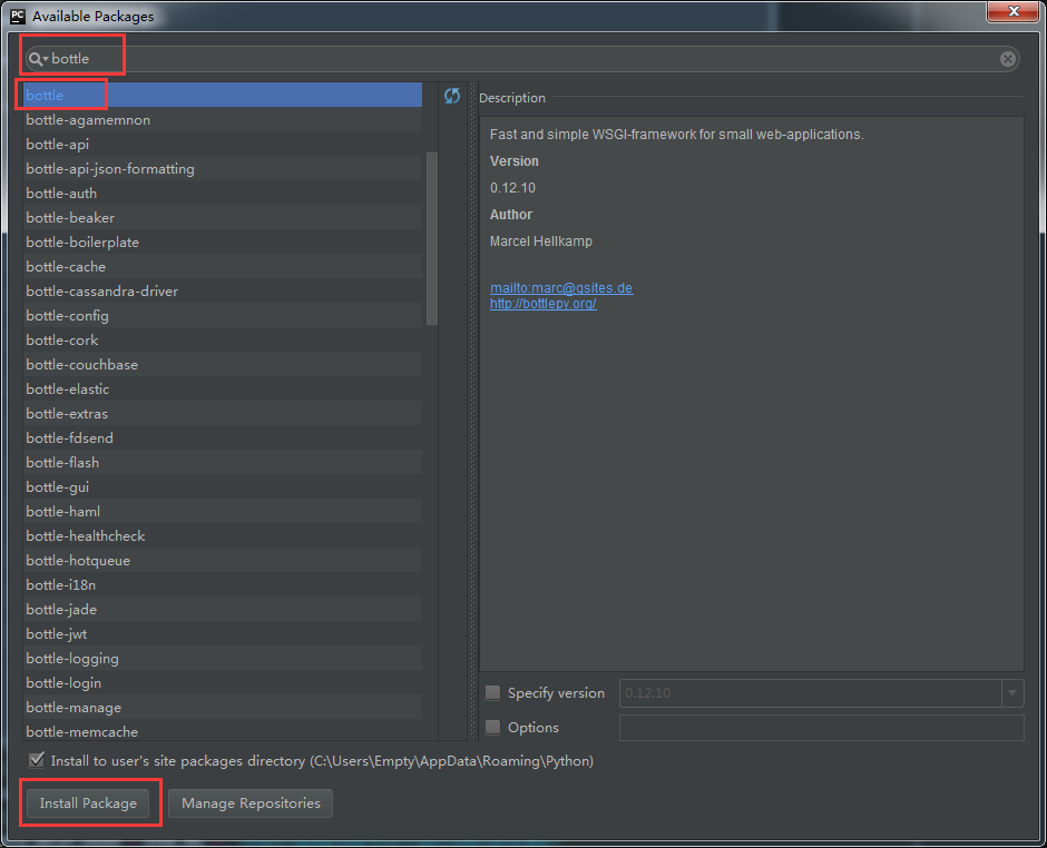 在顶部搜索框里输入想要安装的包名称,就可以搜索到安装包,然后选择它,点击左下角的Install Package,IDE就开始进入下载安装了,如果出现由于网络原因造成安装失败,可以点击其他项后再点回来,然后点安装,多次后就可以安装成功,反复进行后还是无法安装成功的,可以点击查看出错原因,也可以使用命令方式进行,直接看到出错原因。