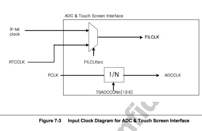 • ADCLCK是ADC的时钟,它是PCLK经过一次分频得到的,在使用ADC前需要在TSADCCCON的13到6位设置分频系数,来初始化ADC的时钟转换器