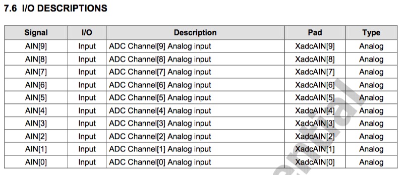 • ADC引脚分两种,数字引脚和模拟引脚,GPIO类输入数字引脚,ADC channel属于模拟引脚(XadcAIN_n),数字引脚和模拟引脚不能混用