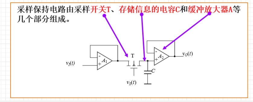 (2)当vs为低电平时,S断开,保持阶段,此时由于电容无放电回路,所以vO保持在上一次采样结束时输入电压的瞬时值上。