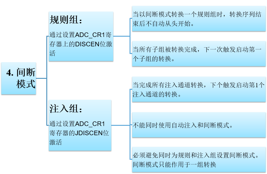 STM32F4的ADC的各通道可以①单次,②连续,③扫描或者④间断模式执行。