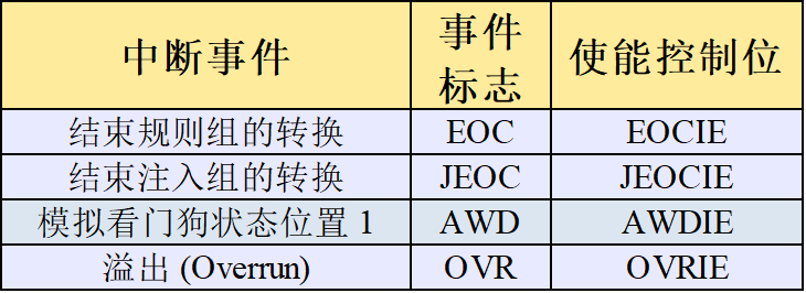 当模拟看门狗状态位和溢出状态位分别置 1 时,规则组和注入组在转换结束时可能会产生中 断。可以使用单独的中断使能位以实现灵活性。
