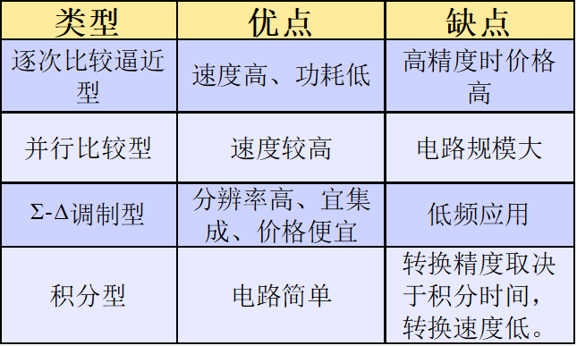 ADC有很多的类型大致可以分为**逐次比较逼近型、并行比较型、积分型、Σ-Δ调制型、及压频变换型。**这些个类型。具体是什么请自行百度。