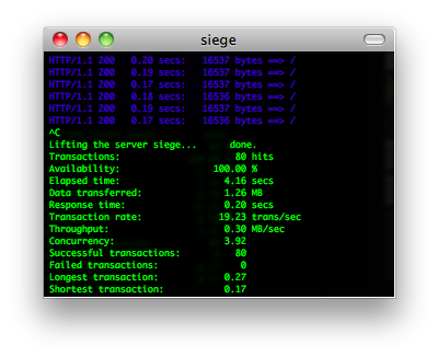 siege是一个压力测试和评测工具,设计用于WEB开发这评估应用在压力下的承受能力:可以根据配置对一个WEB站点进行多用户的并发访问,记录每个用户所有请求过程的相应时间,并在一定数量的并发访问下重复进行。