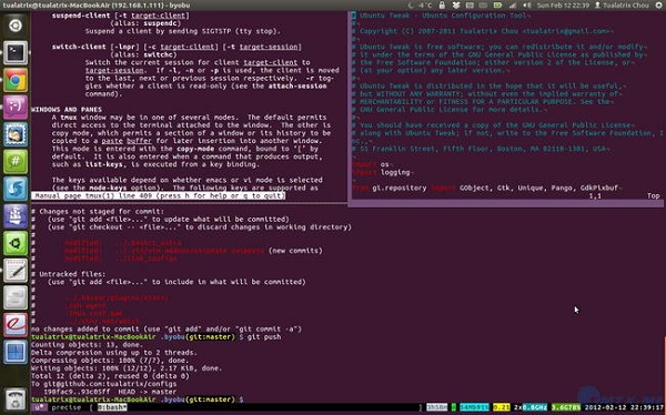 byobu是Ubuntu开发的,在Screen的基础上进行包装,使其更加易用的一个工具。最新的Byobu,已经是基于Tmux作为后端了。可通过“byobu-tmux”这个命令行前端来接受各种与tmux一模一样的参数来控制它。Byobu的细节做的非常好,效果图如下: