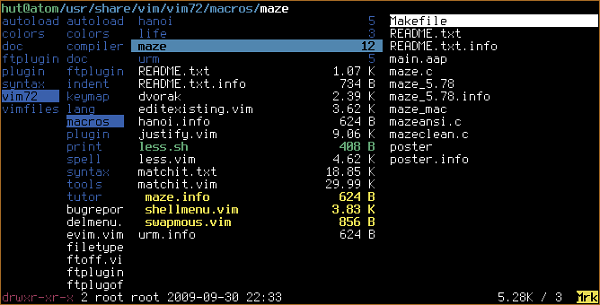 Ranger用 Python 完成,默认为使用 Vim 风格的按键绑定,比如 hjkl(上下左右),dd(剪切),yy(复制)等等。功能很全,扩展/可配置性也非常不错。类似MacOS X下Finder(文件管理器)的多列文件管理方式。支持多标签页。实时预览文本文件和目录。
