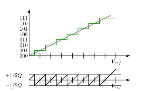 在ADC当中,众多模拟量会被转化成同一种数字量,而对应同一个数字量的模拟量之间的最大差值被称为Q,并且Q=LSB。模拟输入和数字输出之间的差值被称为量化误差(quantization error),量化误差的范围是±Q/2。