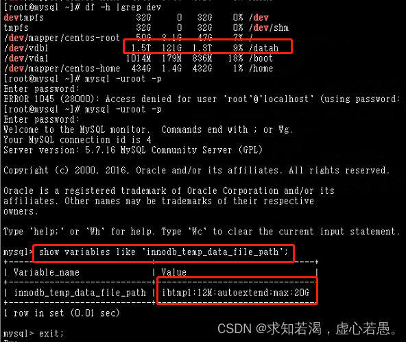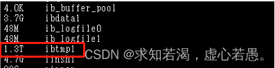以上就是沉静月饼最近收集整理的关于Mysql里的ibtmp1文件太大,导致磁盘空间被占满一、查看磁盘的时候发现磁盘空间100%二、 排查的时候:查看是什么文件占用的时候,发现是数据库临时表空间增长的三、为了避免以后再次出现ibtmp1文件暴涨,限制其大小,需在配置文件加入四、重启Mysql实例(重启后ibtmp1文件会自动清理)五 、重启后,验证配置是否生效总结:的全部内容,更多相关Mysql里的ibtmp1文件太大,导致磁盘空间被占满一、查看磁盘的时候发现磁盘空间100%二、内容请搜索靠谱客的其他文章。