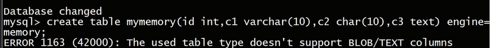 create table mymemory(id int,c1 varchar(10),c2 char(10),c3 text)engine=memory;