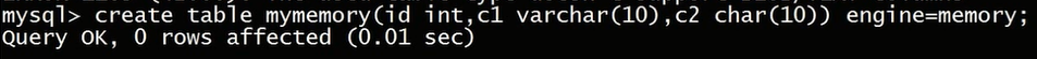 create table mymemory(id int,c1 varchar(10),c2 char(10))engine=memory;