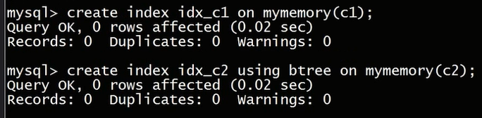 在这里我们为mymemory两个表建立索引,一个是在c1列上的索引,并不指定索引的类型