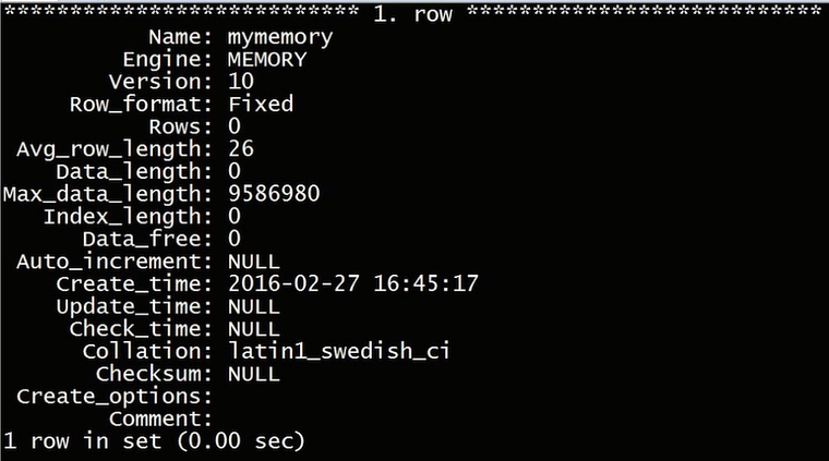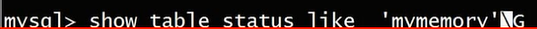 show table status like 'mymemoryG'