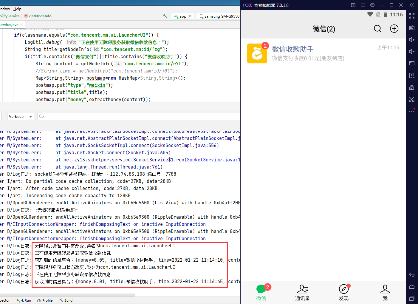 2、通过查看debug日志 ,发现无障碍服务已经连接成功了,现在我用另一个微信号扫收款二维码进行付款,看看能不能监听到。