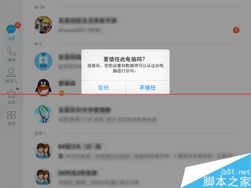4、噔噔噔噔!!这是什么选项吖?不管是iPhone还是iPad,只要你更新到iOS8.2就有这个安全提示,基于安全性的考虑,你只有选择信任,ipad才会开放访问权