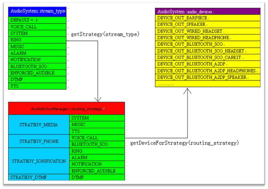 以上就是鲤鱼战斗机最近收集整理的关于音频流分析 五 策略与流类型1 stream_type—流类型2 routing_strategy—策略3 audio_devices--输入输出设备定义4 stream_type、device、strategy三者间的关系5 getStrategy--流类型与策略之间的映射关系函数 6 audio_mode—模式的全部内容,更多相关音频流分析内容请搜索靠谱客的其他文章。