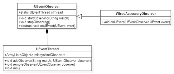 拿到socket的内容后,需要通知对它感兴趣的模块。这里就使用了观察者模式。Android在frameworks/base/services/Java/com/android/server/WiredAccessoryManager. java中实现对UEvent的处理。在这个文件中,从UEventObserver中继承了类WiredAccessoryObserver,在makeObservedUEventList中将要观察的事件加入到UEvent系统中: