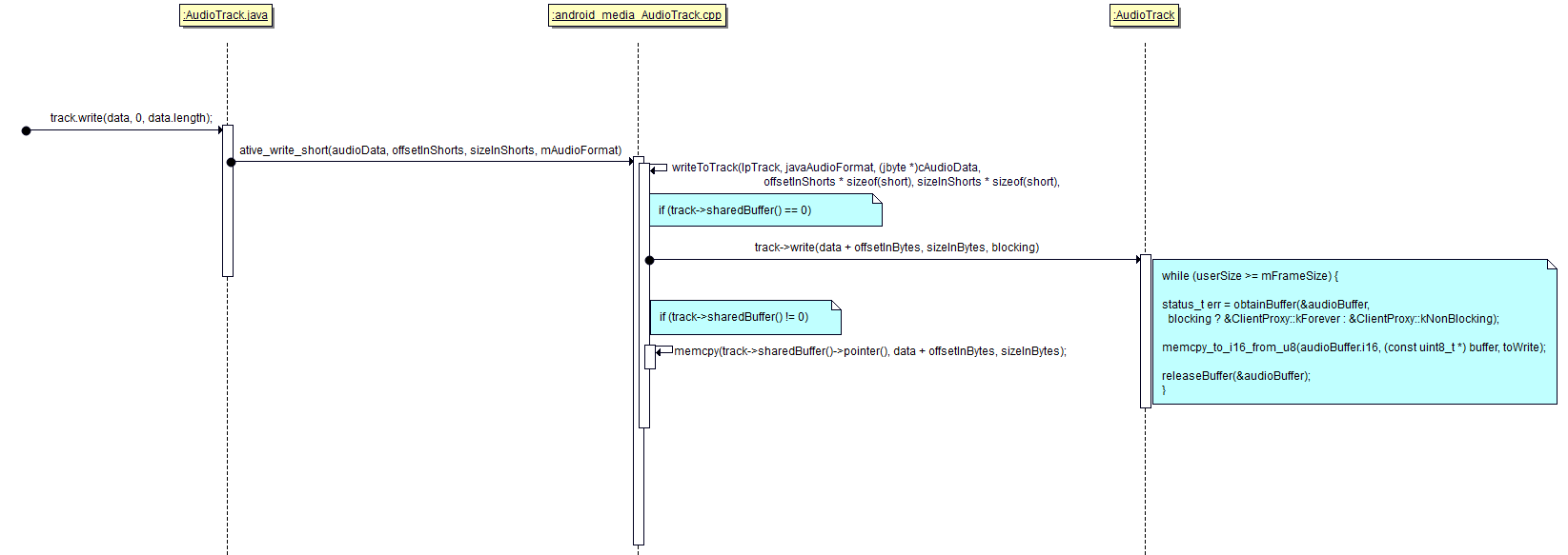d. AudioTrack中含有mProxy, 它被用来管理共享内存, 里面含有obtainBuffer, releaseBuffer函数