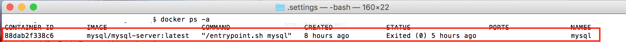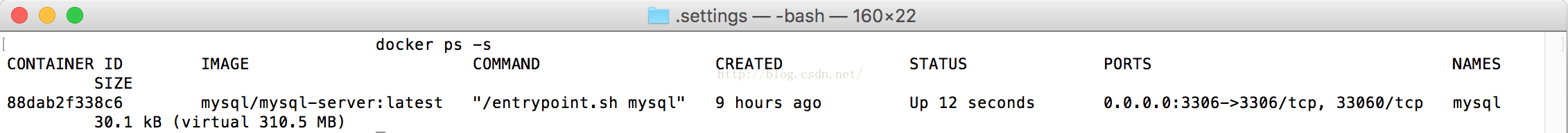 再一次执行docker ps -s命令,结果如图4,说明mysql启动成功。