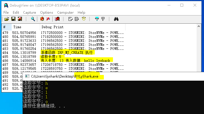 我们首先从内核中读出前五个字节并放入缓冲区内,输出该缓冲区内的数据,然后在调用写入,将hello lyshark写回到内核里里面,这段代码可以这样来写。