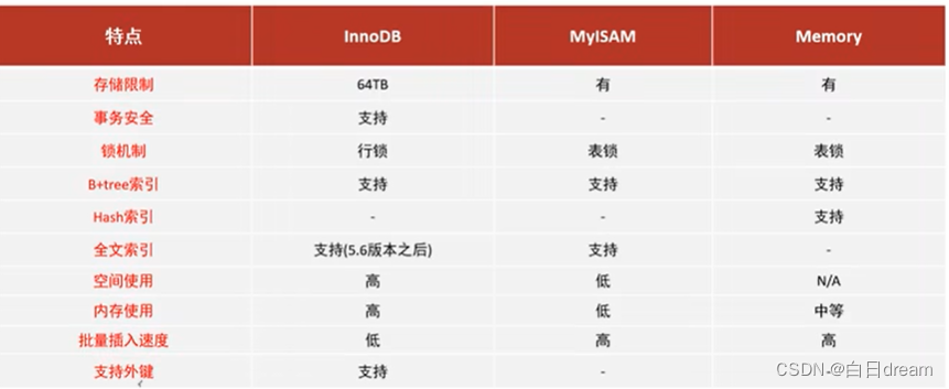 Memory:将所有的数据保存在内存中,访问速度快,通常用于临时表及缓存。Memoey的缺陷是对表的大小有限制,太大的表无法缓存在内存中,而且无法保障数据的安全性。