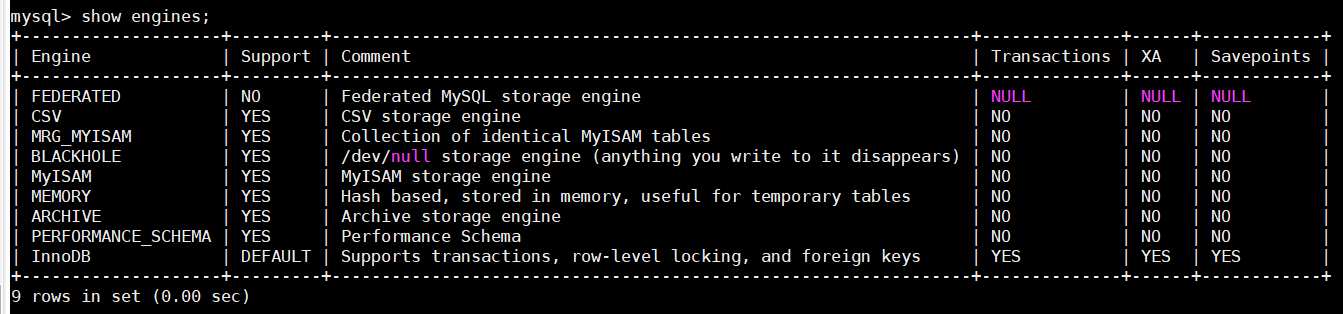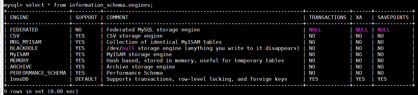 - 可以通过SHOW ENGINES语句查看当前使用的MySQL所支持的存储引擎,也可以通过查找information_schema中的ENGINES表
