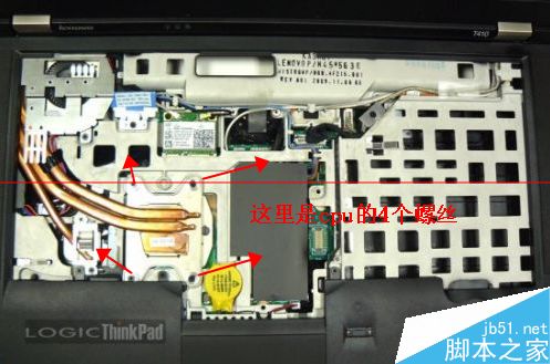 2、把键盘拿出来的时候一定要小心下面有个链接线扣的,不要用力的拔会坏的,键盘拿出来后就可以看到散热装置了。把cpu上4个固定螺丝取下就能看到cpu了。涂抹上一点散热硅脂就行了。