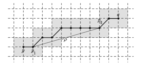5)链码与形状数。给定一副图像,方格里面是一个封闭的边界,也给了8向链码的基准方向,请写出它的链码和形状数,还问形状数消除了起点、旋转和尺度三者中的哪些影响,图像类似于: