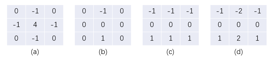 3)梯度算子。问下图(a)和图(b)是什么算子,图(c)和(d)在图(b)的基础上怎么扩展的,图(d)为什么比图(c)的效果好