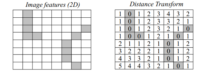 7)距离变换。给定一个二值图像,图像了里面是一个类似T的字母,请你在图像完成它的距离变换,第二问给定一个模板,在原图像上指定一点,求它的Chamfer distance,原图像类似于: