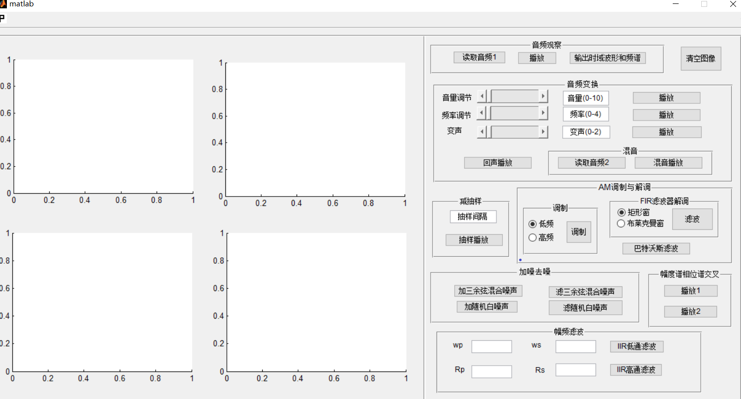 这个界面涉及功能众多,其中包括语音信号的观察分析、音色变换、AM调制解调、减抽样、加噪去噪、相频分析和幅频滤波等,最重要的是对MATLAB中函数的掌握,通过不同函数的组合实现你想要实现的功能。
