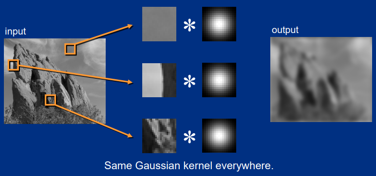 左图使用的是高斯滤波,权重符合二维高斯分布,中间权重高,越往外权重越低,在各个方向上距中心同一距离的位置上的权重是一致的。这样的卷积核简单粗暴,不管图像颜色信息如何,统一对待,所以在输出图像上可见山石边缘也变得非常模糊。