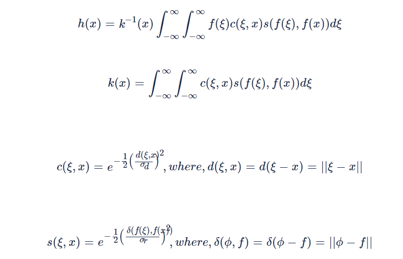 双边滤波组合了空间上邻近程度的权重和像素颜色值相似程度的权重。公式如下: