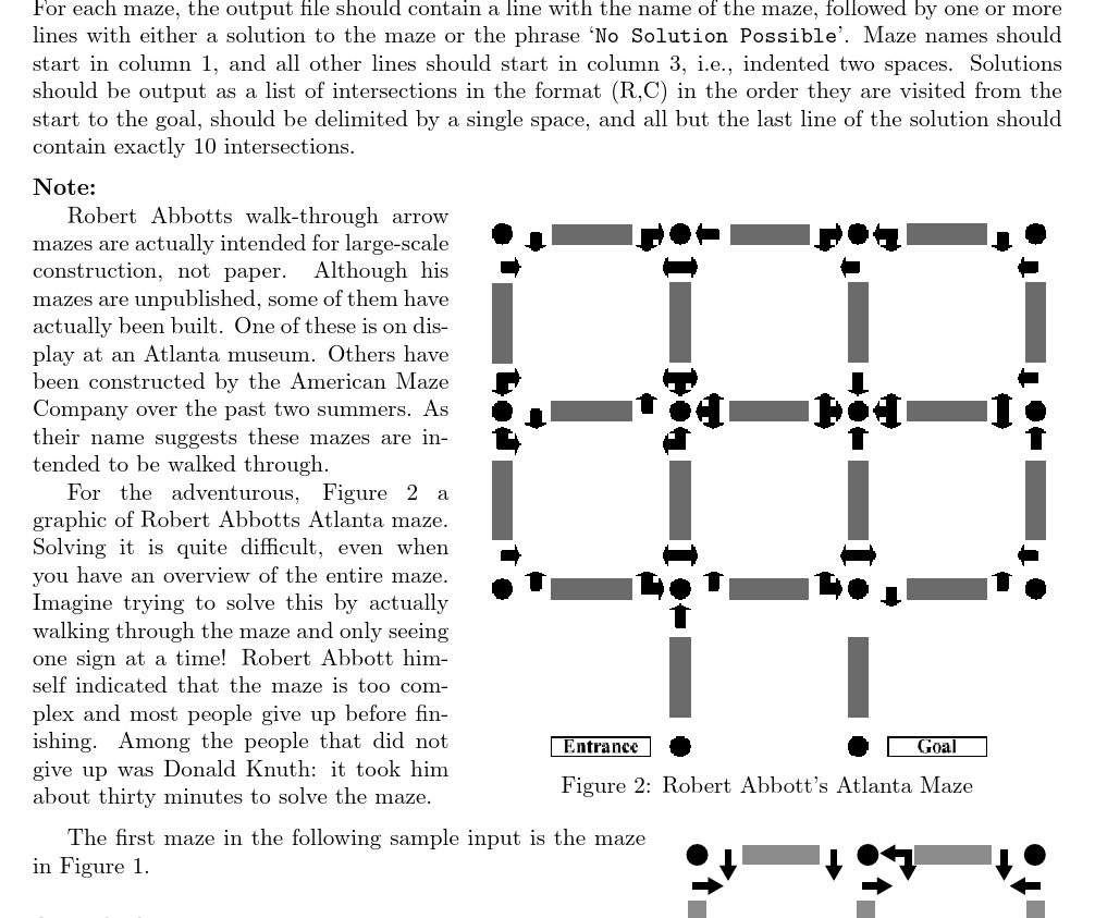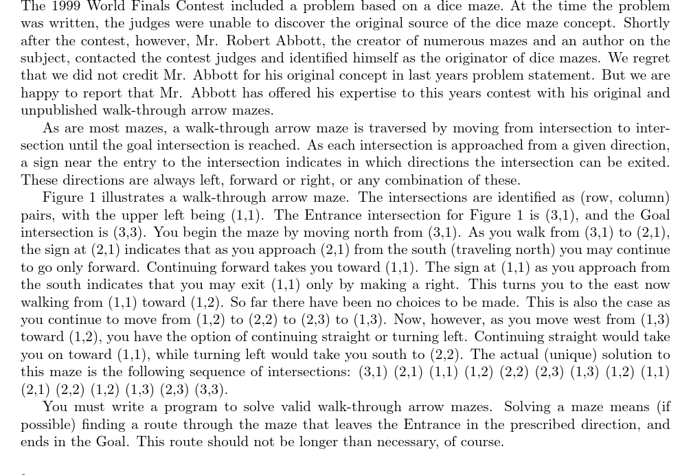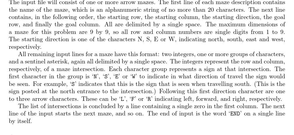 1 #include <cstdio> 2 #include <iostream> 3 #include <cstring> 4 #include <vector> 5 #include <queue> 6 #define max_n 10 7 using namespace std; 8 struct Node 9 { 10 int r; 11 int c; 12 int dir; 13 Node(int r1=0,int c1=0,int d1=0) :r(r1),c(c1),dir(d1) {} 14 //构造Node,带有默认参数,不然会在Node p[][][]那里报错,认为这个语句是在构造Node 15 }; 16 int d[max_n][max_n][4];//表示初始状态到(r,c,dir)的最短路长度 17 Node p[max_n][max_n][4];//保存了状态(r,c,dir)在BFS数中的父结点 18 int has_edge[max_n][max_n][4][3];//当前状态是(r,c,dir),是否可以沿着转弯方向turn行走 19 20 //行走 21 const char* dirs = "NESW"; //顺时针旋转的顺序 22 const char* turns = "FLR"; 23 int dir_id(char c) {return strchr(dirs,c)-dirs;} //将char类型的dir转化为dirs中相应的所在位置 24 int turn_id(char c) {return strchr(turns,c)-turns;}//将char类型的turn在turns中找到对应的元素位置 25 const int dr[] = {-1,0,1,0};//用上面找到的元素位置来确定当前行行走方向 26 const int dc[] = {0,1,0,-1};//用上面找到的元素位置来确定当前列行走方向 27 char maze[21];//迷宫名称 28 int r0,c0,dir;//原始位置和方向 29 int r1,c1;//初始位置和方向 30 int r2,c2;//目标位置 31 //巧妙的行走函数和对应关系 32 //dirs 0N 1E 2S 3W 33 //顺时针 34 //dir' 3 0 1 2 35 //逆时针 36 //dir' 1 2 3 0 37 //dr -1 0 1 0 38 //dc 0 1 0 -1 39 Node walk(const Node& u,int turn) 40 { 41 int dir = u.dir; 42 if(turn==1) dir = (dir+3)%4; 43 if(turn==2) dir = (dir+1)%4; 44 return Node(u.r+dr[dir],u.c+dc[dir],dir); 45 } 46 //判断越界函数 47 int inside(int r,int c) 48 { 49 return 0<r&&r<=9&&0<c&&c<=9; 50 } 51 //输出函数 52 //要求: 53 //第一行输出迷宫名 54 //后几行输出路径,且除最后一行外,其他每行都是空两格+10个(r,c)形式空格分隔的坐标 55 void printa(Node u) 56 { 57 vector<Node> nodes;//可用递归方式打印,但可能溢栈,可改用循环,用vector存储 58 for(;;) 59 { 60 nodes.push_back(u); 61 if(d[u.r][u.c][u.dir]==0) break; 62 u = p[u.r][u.c][u.dir]; 63 } 64 nodes.push_back(Node(r0,c0,dir)); 65 66 int cnt = 0; 67 for(int i = nodes.size()-1;i>=0;i--) 68 { 69 if(cnt%10==0) //值得品味的细节1 70 { 71 printf(" "); 72 } 73 printf(" (%d,%d)",nodes[i].r,nodes[i].c); 74 if(++cnt%10==0)//值得品味的细节2 75 { 76 printf("n"); 77 } 78 } 79 if(nodes.size()%10!=0) 80 { 81 printf("n"); 82 } 83 } 84 //输入函数 85 //先读入迷宫名,若为END返回0, 86 //然后一行读入起点r,c,dir,终点r,c 87 //然后处理交叉处的方向改变,将这些信息用数组has_edge[r][c][dir][turn]记录下来,为以后BFS提供基础 88 //读到*结束小循环,读到0结束大循环 89 int read() 90 { 91 cin >> maze; 92 if(maze[0]=='E'&&maze[1]=='N'&&maze[2]=='D'&&strlen(maze)==3) return 0; 93 cout << maze << endl; 94 memset(maze,0,sizeof(maze[0])); 95 96 char dirs; 97 cin >> r0 >> c0 >> dirs >> r2 >> c2; 98 dir = dir_id(dirs); 99 r1 = r0+dr[dir]; 100 c1 = c0+dc[dir]; 101 memset(has_edge,0,sizeof(has_edge)); 102 103 for(;;) 104 { 105 int r,c; 106 cin >> r; 107 if(r==0) 108 { 109 break; 110 } 111 cin >> c; 112 char chr[99]; 113 while(cin >> chr) 114 { 115 if(chr[0]=='*') 116 { 117 break; 118 } 119 for(int i = 1;i<strlen(chr);i++) 120 { 121 has_edge[r][c][dir_id(chr[0])][turn_id(chr[i])] = 1; 122 } 123 //cout << r << " " << c << " " << chr << endl; 124 memset(chr,0,sizeof(chr[0])); 125 } 126 } 127 return true; 128 } 129 //BFS主过程 130 void solve() 131 { 132 queue<Node>q; 133 memset(d,-1,sizeof(d)); 134 Node u(r1,c1,dir); 135 d[u.r][u.c][u.dir] = 0; 136 q.push(u); 137 while(!q.empty()) 138 { 139 Node u = q.front();q.pop(); 140 if(u.r==r2&&u.c==c2) 141 { 142 printa(u); 143 return; 144 } 145 for(int i = 0;i<3;i++) 146 { 147 Node v = walk(u,i); 148 if(has_edge[u.r][u.c][u.dir][i]&&inside(v.r,v.c)&&d[v.r][v.c][v.dir]<0) 149 { 150 d[v.r][v.c][v.dir] = d[u.r][u.c][u.dir] +1; 151 p[v.r][v.c][v.dir] = u; 152 q.push(v); 153 } 154 155 } 156 } 157 printf(" No Solution Possiblen"); 158 } 159 int main() 160 { 161 while(read()) 162 solve(); 163 return 0; 164 }