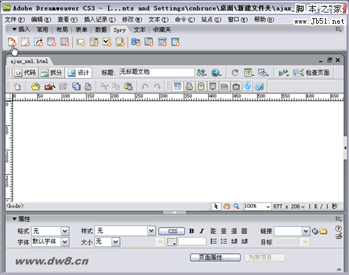 在网页中打开【插入】面板,单击【Spry】标签下的【Spry XML 数据集】